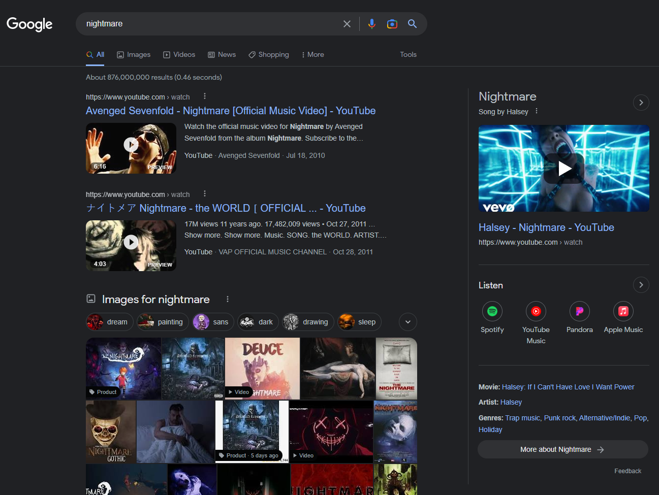 Google’s search result page for the term ‘nightmare’